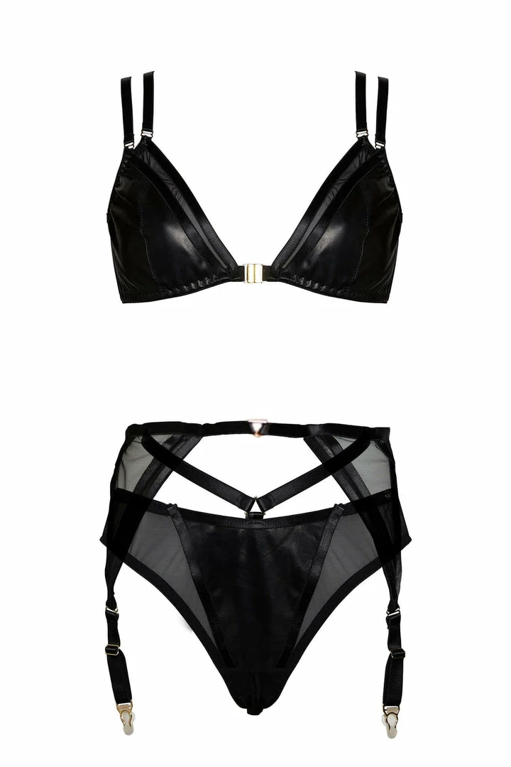 This is luxury lingerie that can keep up with all your desires, and your secret weapon for boundless confidence. The angles of the leather create a flattering shape to show off your curves, while the gold metal front fastening clasp and matching gold triangular details adds the perfect finishing touch.