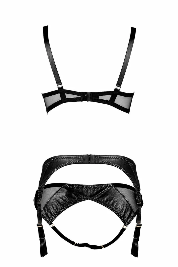 Command attention in the Montana Balconette Open Back Leather Set. A piece designed and handcrafted with classic inspirations finished in a luxurious and contemporary Japanese Plonge leather. Underwear meets outerwear in this modern, statement collection. Montana is Art deco inspired, with sharp straight lines and cut out details.