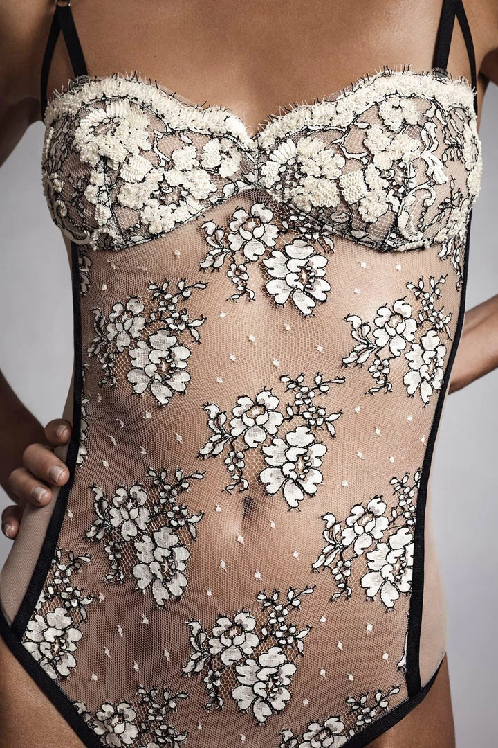 Beaded Chantilly lace front bodice and cups. Italian stretch net side panels and grosgrain elastic seams. Sheer center back with thong bottom. Dual delicate straps meet into fully adjustable straps at the back.