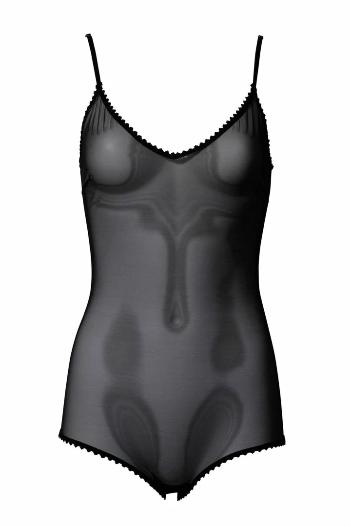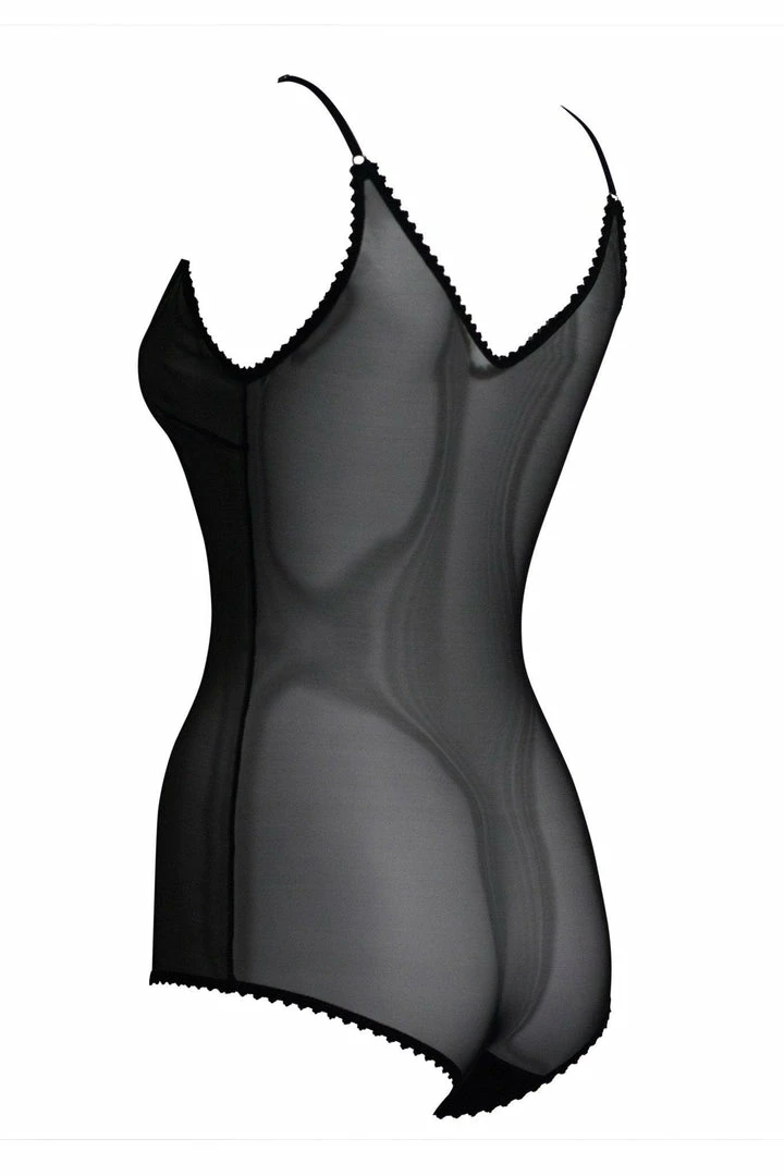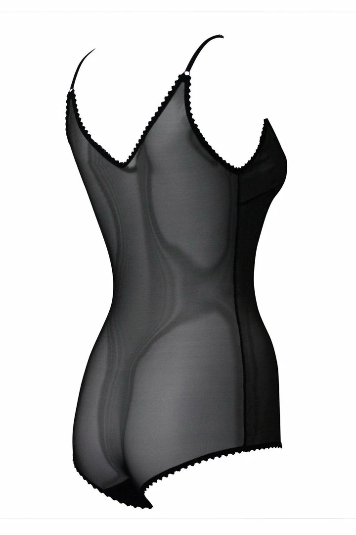 “V” neck adjustable spaghetti strap bodysuit with cabaret leg line and picot edge elastic trim.