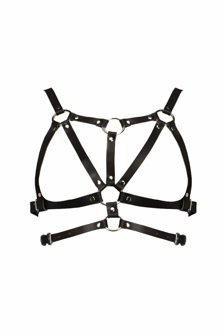The Powerless Leather Harness from the Luxe Bondage collection is handmade from high quality Portuguese leather, drawing the attention to your beautiful bosom with its open cup design.