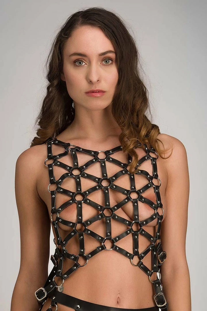 Submissive Leather Harness from the Luxe Bondage collection is handmade from high-quality Portuguese leather and the impressive lines of leather straps beautifully frame your feminine shapes.